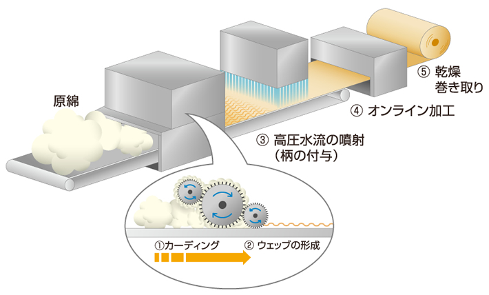 コットンなどの短繊維にカーディングを行って繊維を整えてウェッブを作る。そのウェッブ上にジェット水流を噴射し、水圧によって繊維同士を絡み合わせてシート状に結合させる。